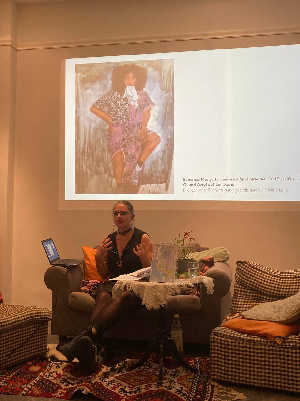 in Sunanda Mesquitas Gemälde Silenced by Academia (2015)” der Publikation “Queere Künstler_innen of Color — Verhandlungen von Disidentifikation, Überleben und Un-Archiving im deutschen Kontext” schreibt Rena Onat folgendes: