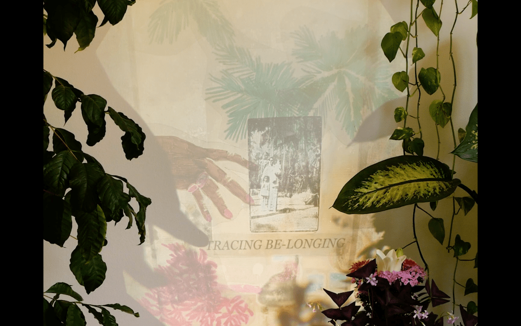 In the short film „Tracing Belonging – Embodied Archives“, Sunanda Mesquita dives into transdisciplinary explorations while overlapping, combining, merging drawings, collages and dias from the family archives via a projector onto walls, plants, flowers and objects creating an altar-like installation that speaks to the ephemerality of memory, ancestral and embodied knowledge.