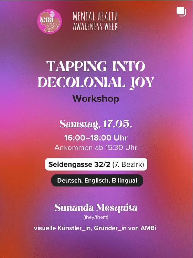 In dem zwei-stündigen Workshop werden wir Möglichkeiten auf- und nachspüren, wie wir dekoloniale Freude in unsere (kreative) Arbeit, unseren Aktivismus, unsere Beziehungen und unser Zusammensein mit anderen Menschen ins Zentrum stellen können. Mit welchen Werkzeugen können wir uns (wieder) verbinden? Welche Strategien müssen (neu) erfunden werden? Tapping into Decolonial Joy bietet einen Raum, um aufzutanken, sich inspirieren zu lassen und daran erinnert zu werden, dass wir selbst in herausfordernden Momenten Trost in der Fülle von Unterstützung und Ressourcen finden können, die uns jederzeit zur Verfügung stehen. Du bist eingeladen, deine Lieblingszitate, Bücher oder Referenzen mitzubringen, die dich inspirieren und die du mit dem Thema verbindest. Während des Workshops wird es Gelegenheit zum Ausruhen und stillen Kontemplation geben, und es besteht die Möglichkeit, sich in kleineren Gruppen auszutauschen.